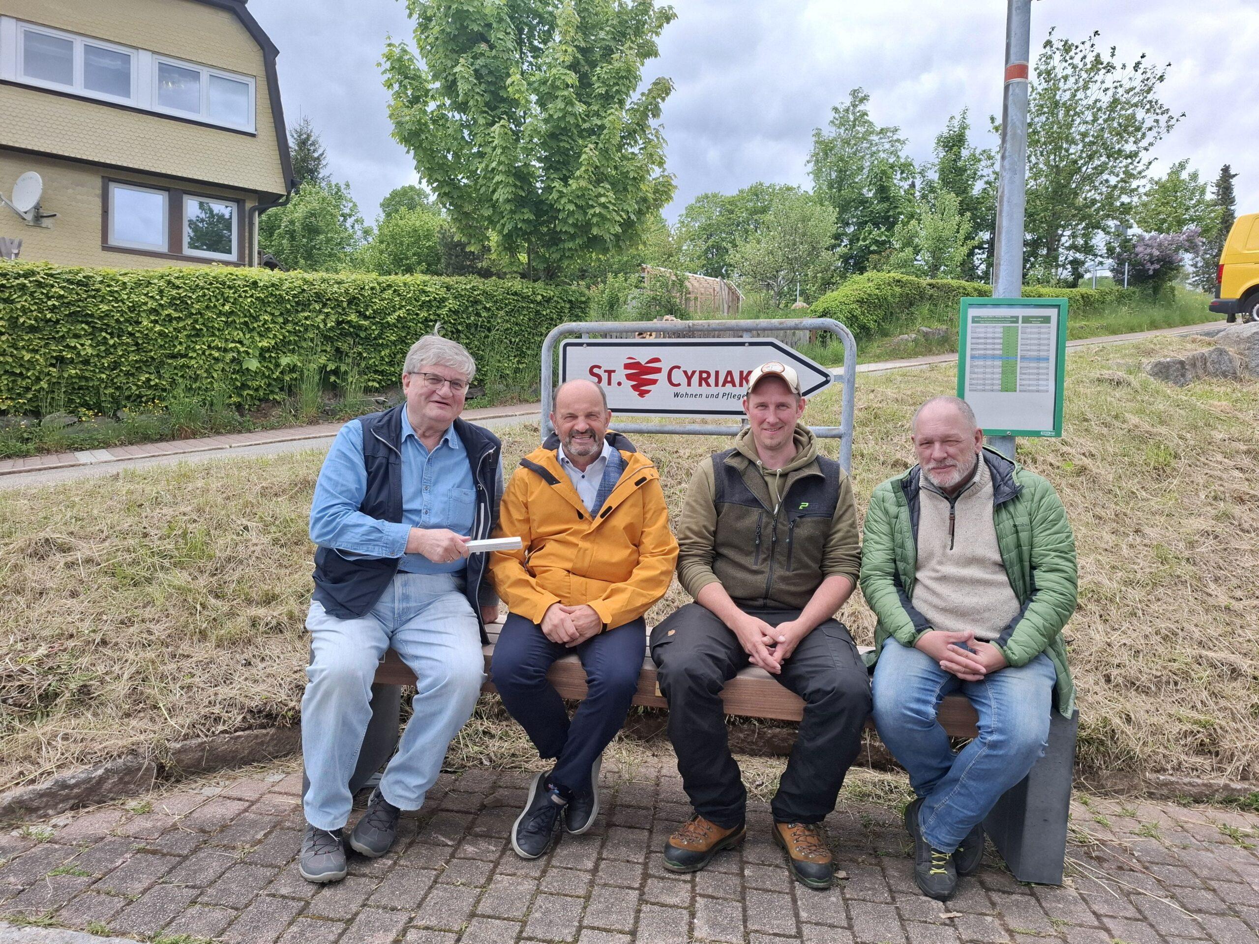 Ein lang gehegter Wunsch ist in Erfüllung gegangen. Vielfach wurde an die Bürgerstiftung Furtwangen der Wunsch herangetragen eine Bank im Eigenheimweg Richtung Altenheim St. Cyriak aufzustellen. Die Bewohner des Altenheims nutzen die Strecke sehr gerne für kleine Spaziergänge, da sie hier eben gehen können. Eine Bank zum Verschnaufen war nun schon lange der Wunsch. Jetzt steht die Bank auf dem Gehweg neben dem Haus des ehemaligen evangelischen Pfarrers Lutz Bauer. Die Bürgerbushaltestelle vom Altenheim wurde auch an die Ruhebank vorverlegt, dass die Busnutzer die Bank ebenfalls nutzen können während der Wartezeit bis der Bus kommt. Im Bild wird die Bank gerade getestet von links Lutz Bauer, Bürgermeister Josef Herdner (Bürgerstiftung), Mathias Fehrenbach (Eigenbetrieb Technische Dienste) und Rainer Lübbers (Bürgerstiftung). Bild: Simon